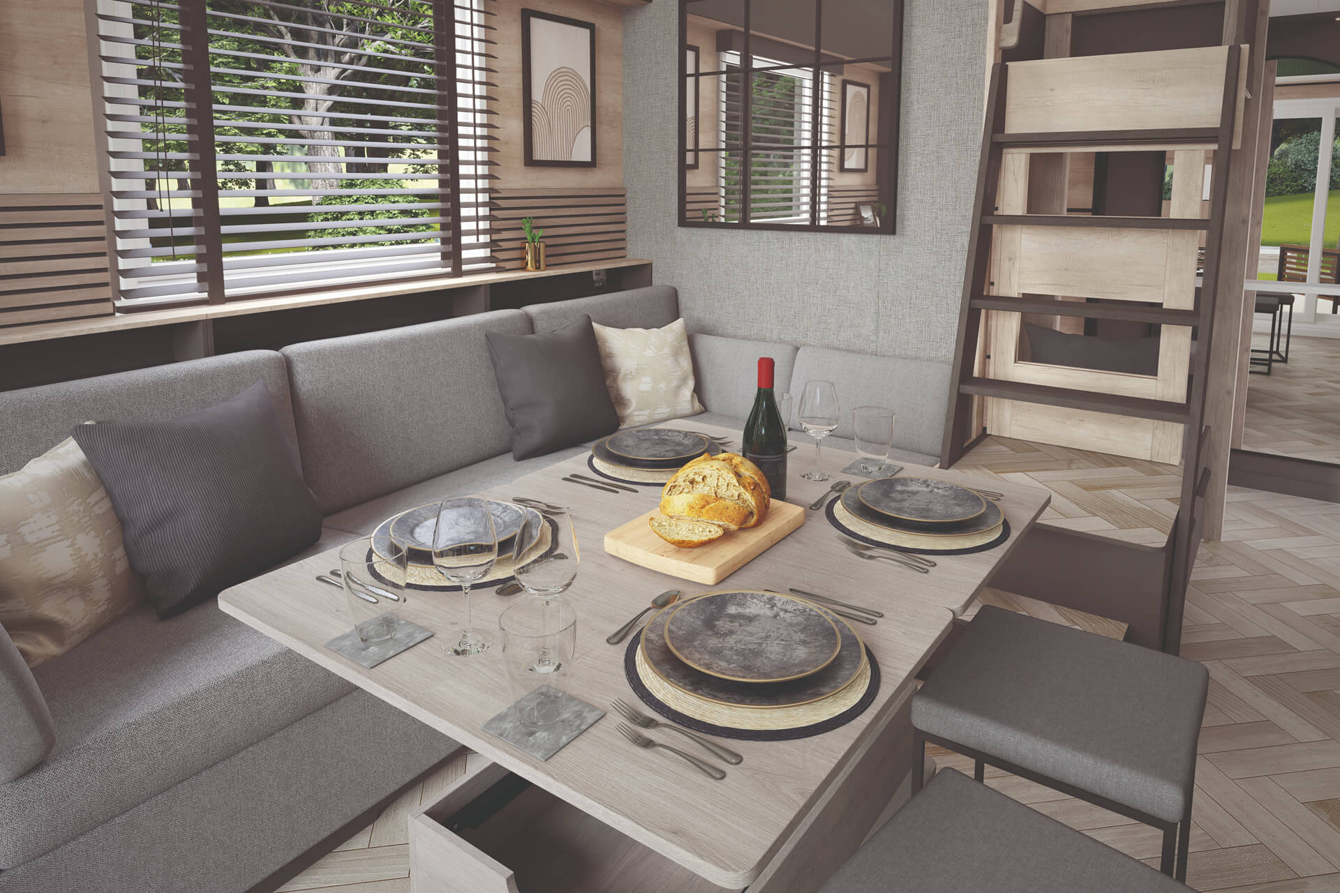 The open-plan interior makes a stylish statement with trendy and resilient 'Herringbone' patterned vinyl flooring and slatted 'Naturewall' panelling throughout, reinforcing the natural aesthetic.